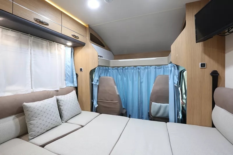 驾驶室上方双人床,卡座与升降餐桌组合成榻榻米,车厢后部纵置双人床,可满足多人睡眠需求。